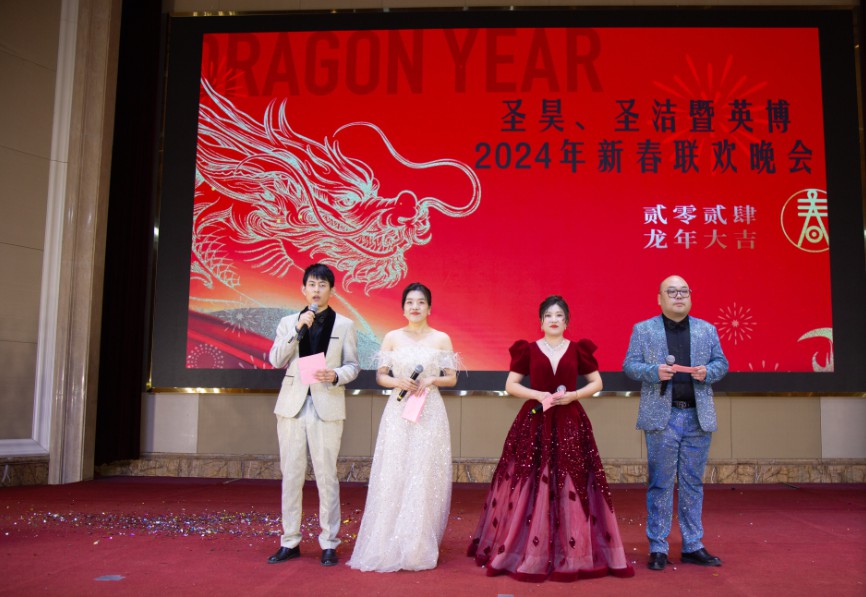 工作会顺利结束,2024年新春联欢晚会正式开始。圣洁公司、英博公司、圣昊公司共同联欢,晚会还邀请了员工家属、股东代表、嘉宾等。